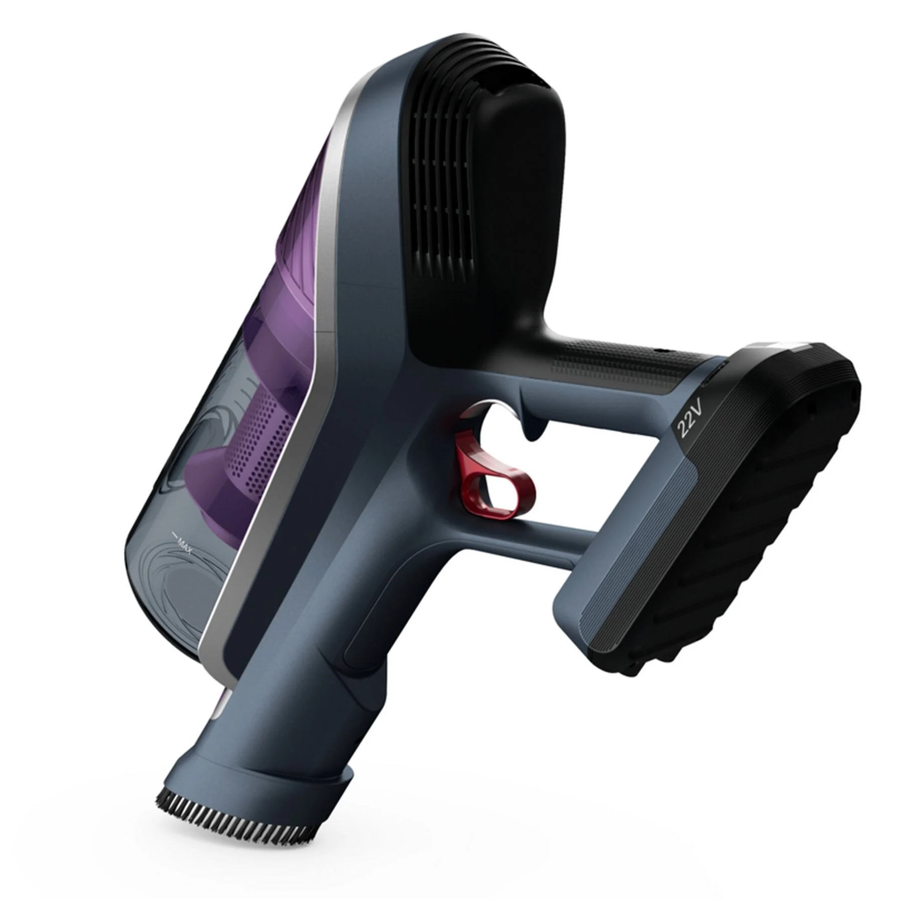 Con 6 celdas y 22 V de potencia, la batería de extracción fácil garantiza una limpieza potente y constante de hasta 45 minutos cuando se usa la aspiradora de mano. Perfecta para limpiar tu hogar sin necesidad de recarga. Si necesitas más autonomía, puedes aumentarla y seguir aspirando hasta 1 h 10 min comprando una batería adicional.