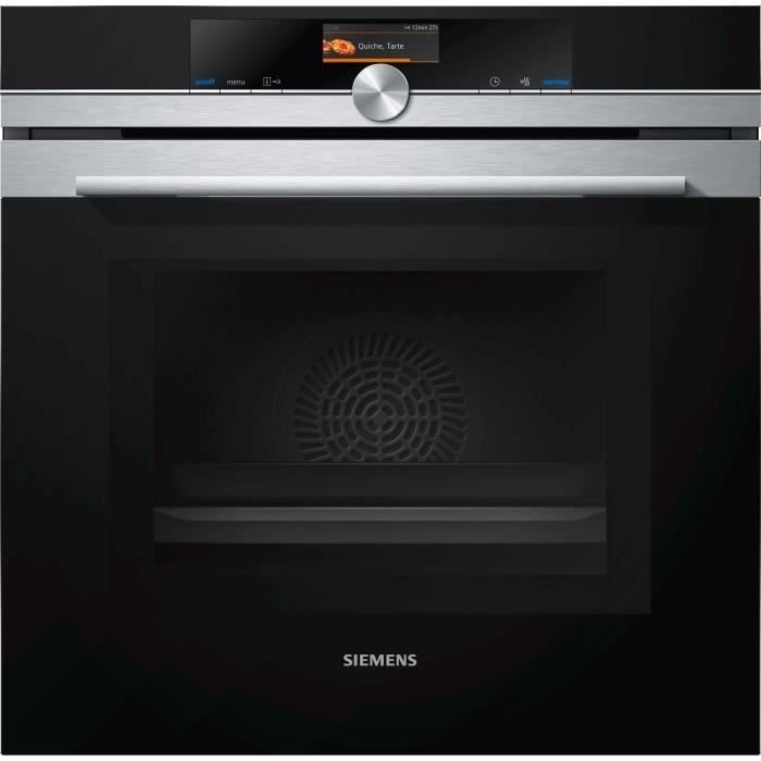 SIEMENS – Horno microondas combinado pirólisis acero inoxidable 67 l – Pantalla táctil TFT color 3,7′ con texto claro – Pulsador único central – 13 modos de cocción – Función VarioSpeed – Home Connect – Puerta abatible, sistema SoftMove – Puerta fría 4 cristales – Visualización de recomendación y temperatura – Riel telescópico de 1 nivel