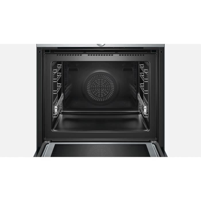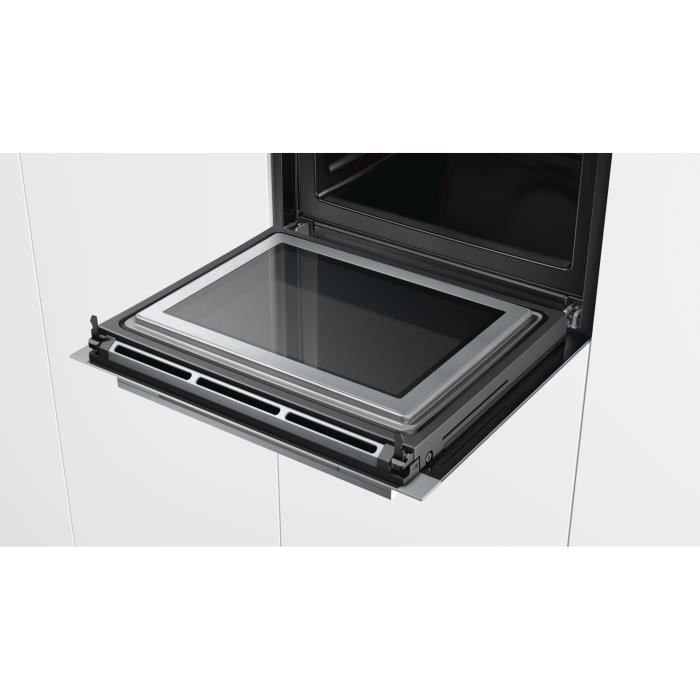 Limpieza pirolítica Estantes y bandejas de horno pirolíticos Pantalla táctil a color TFT de 3,7″, con texto claro Botón único central Volumen 67 l 13 modos de cocción: aire forzado 4D, convección natural, convección natural Eco, calor superior e inferior, parrilla de superficie grande, parrilla de superficie pequeña , grill de convección, mantenimiento del calor, cocción a baja temperatura, precalentamiento, posición para pizza, hotAir Eco, coolStart (para alimentos congelados) Máx. : 900 W – 5 potencias de microondas (90 W, 180 W, 360 W, 600 W, 900 W) con Innowave System con tecnología Inverter Home Connect: control remoto y monitorización de tu horno Puerta abatible, sistema SoftMove: asistencia de cierre suave ,