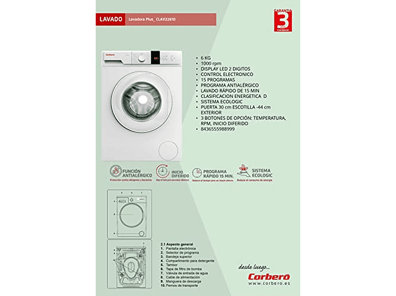 La lavadora Corberó CLAV22610 Gama Plus Carga Frontal es una lavadora de carga frontal de 15 programas con una capacidad de carga de 6 kg. La lavadora tiene una función de inicio diferido, un display LED, una función de lavado rápido y una clasificación energética D. La lavadora también tiene una función antialérgica y es ecológica.